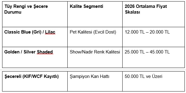 Özellikle son yıllarda büyük ilgi gören "Golden Shaded" veya "Chinchilla" gibi özel renk mutasyonları, klasik "Blue" (gri) yavrulara oranla daha yüksek rakamlarla alıcı bulmaktadır.