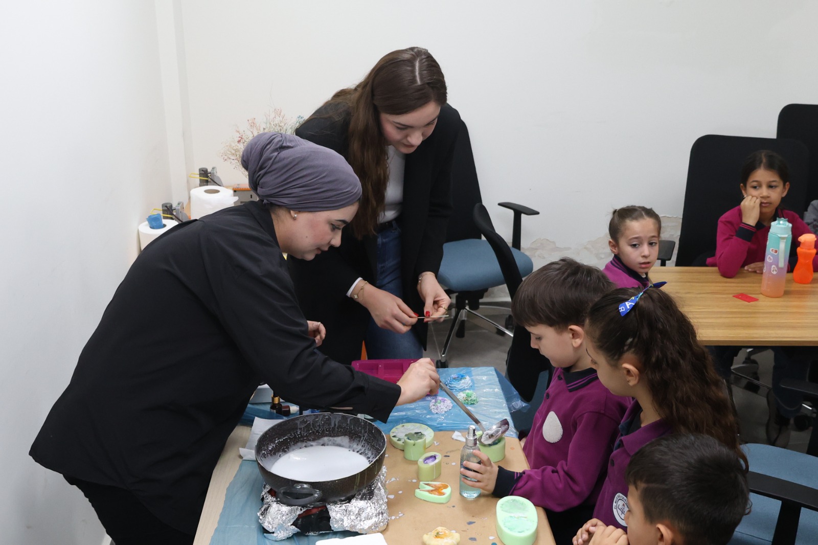 Program çerçevesinde sabun yapımı, ahşap boyama ve resim boyama gibi atölyeler düzenlenirken, tişört tasarım ve boyama etkinliği çocukların yaratıcılıklarını sergiledikleri keyifli anlara sahne oldu.